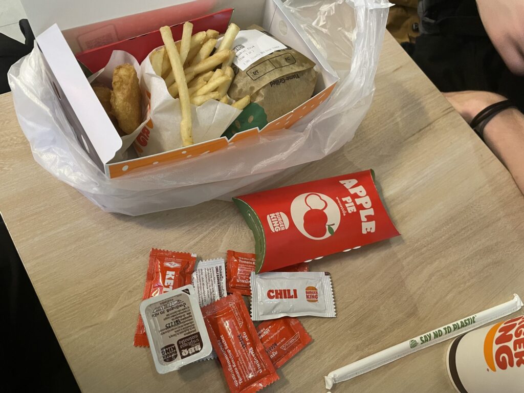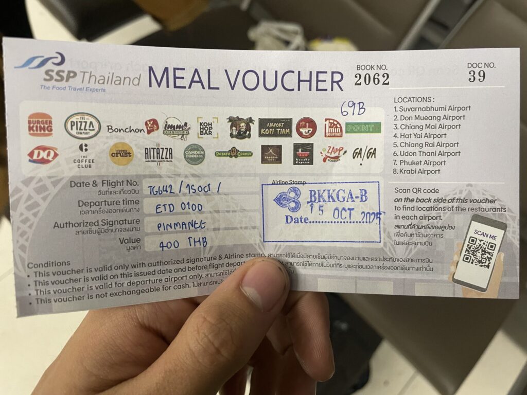 Nach zehn Stunden Flug und kaum Schlaf sind wir in Thailand angekommen und mussten erst einmal eine Stunde schlafen. Dann standne wir vor der Aufgabe 10 Stunden Wartezeit im Flughafen zu überbrücken. In der Zeit sind wir wahrscheinlich viermal durch den ganzen Flughafen gelaufen. Da sich der Flug noch verspätet hat, bekamen wir jeweils einen Gutschein für die Bistros im Flughafen in Höhe von 400 ฿ (Baht), das sind ca. 10,70 €. Damit sind wir dann zu Burger King gegangen, haben unsere beiden Gutscheine zusammengelegt und uns ein viel zu teures Menü sowie Kartoffeltaschen geholt.
